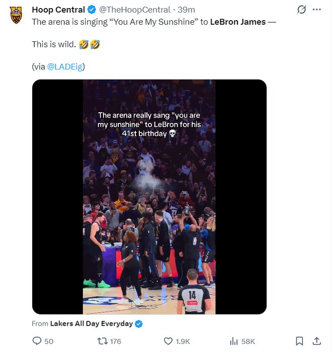 老詹41歲第一次拋鎂粉,全場為他唱起《你是我的太陽》這首歌,用這首歌來為他慶祝生日,老詹頭首節2中2拿到5分1籃板3助攻表現也不錯。