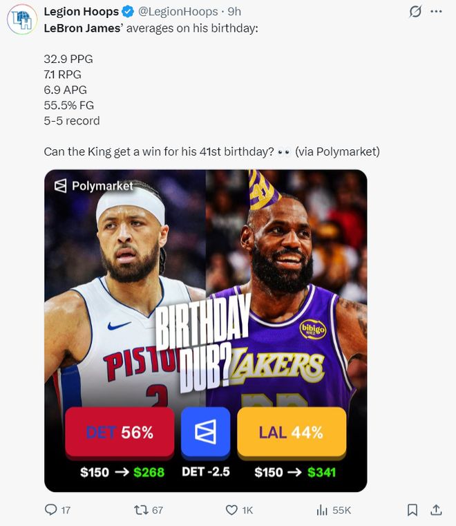 這場比賽是勒布朗-詹姆斯41歲的生日夜,詹姆斯生日夜場均32.9分7.1籃板6.9助攻,命中率55.5%,戰績是5勝5負,他是歷史生日夜場均得分最高的球員。