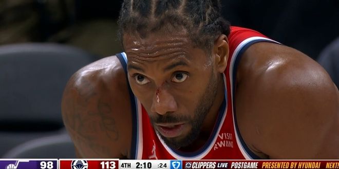 在這之后,小卡顯然是非常生氣,帶著面部的血跡,隨后一人獨砍17分。在末節,小卡獨砍20分,在臉被摳出血之前進了一個三分球,憑借著出色的表現,萊昂納德直接將比賽打花。