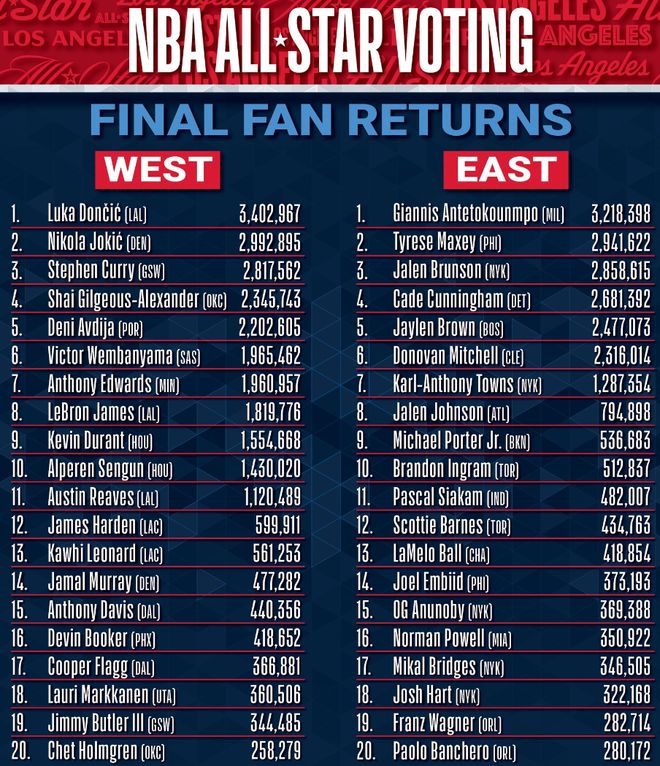 北京時間1月20日,NBA官方公布了最終的全明星球迷投票,快船的萊昂納德561253排在第13,快船的哈登599911排在第12。