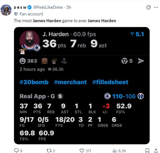 對陣奇才的這場比賽,哈登37分鐘,17中9,罰球18中20,拿到36分9助攻7籃板1搶斷1蓋帽,命中率52.9%,真實命中率69.8%,他又打出了全面的表現。