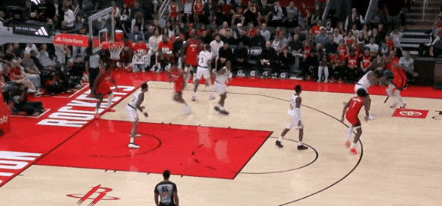 哈登和加雷特二人轉后,喂梅里爾遠射。上半場末尾,梅里爾快下接傳球,和跟進的哈登一個二人傳接,遠射。