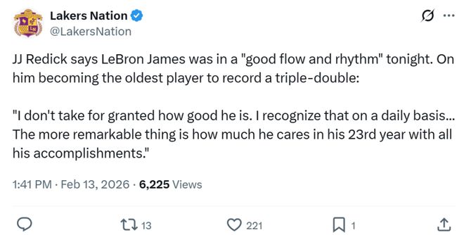 面對詹姆斯如此傲人的表現,湖人名宿沃西感嘆道:“當你認為詹姆斯可能會在全明星周末到來之際放松一下時,結果他一上場就拿了個三雙。”