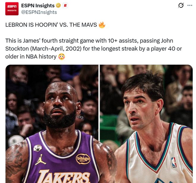 紀錄一:本場是詹姆斯連續(xù)第4場助攻數上雙,成功超越NBA助攻王斯托克頓,刷新NBA歷史上40歲及以上球員助攻連續(xù)上雙場次最長紀錄。