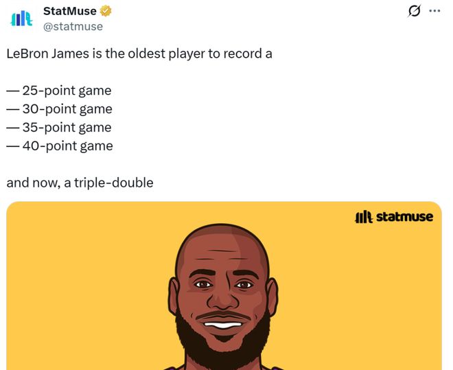 同時詹姆斯也是NBA歷史上單場砍下25分、30分、35分、40分的最老球員紀錄保持者,本場又達成單場三雙最老球員成就,用行動完美詮釋何為“最長的河”。