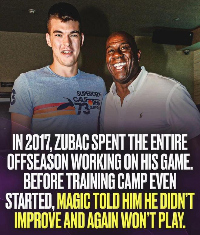 5、新秀賽季結束后,祖巴茨整個夏天都在洛杉磯專注提升自己,沒有為克羅地亞國家隊出戰,但在訓練營開始前,魔術師卻告訴祖巴茨,沒看到他的進步,新賽季依然不會給他太多時間,最終二年級賽季,祖巴茨場均只打了43場比賽,得到9.5分鐘上場時間,交出3.7分2.9籃板;