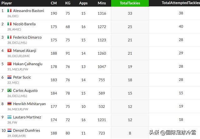 同時,巴斯托尼還是國米的“搶斷王”——他38次嘗試搶斷,33次成功,以較大優勢領先第二名(巴雷拉25次成功)。