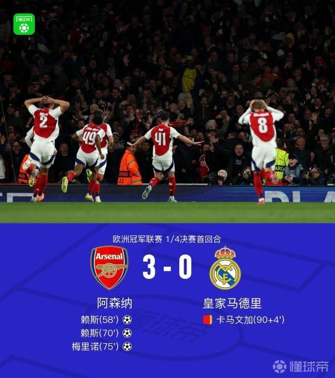 北京時間4月9日,阿森納坐鎮酋長球場迎戰皇家馬德里。上半場帕爾特伊遠射被撲,姆巴佩單刀打高,隨后姆巴佩打門被拉亞撲出,賴斯和馬丁內利打門被庫爾圖瓦神勇撲出,下半場賴斯神級任意球破門,庫爾圖瓦屢次撲救救險,賴斯天外飛仙任意球梅開二度,梅里諾兜射死角鎖定勝局,卡馬文加兩黃變一紅被罰下。最終比分阿森納3-0皇馬。