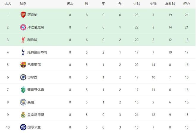 前七輪戰(zhàn)罷,分別排名第九到第十一位的巴塞羅那、葡萄牙體育和曼城最后一輪分別擊敗各自對(duì)手,壓哨闖入前八,最終阿森納、拜仁慕尼黑、利物浦、熱刺、巴薩、切爾西、葡萄牙體育和曼城分別排名第一到第八,而此前高居第三的皇馬,只能以第九名的身份去參加附加賽。