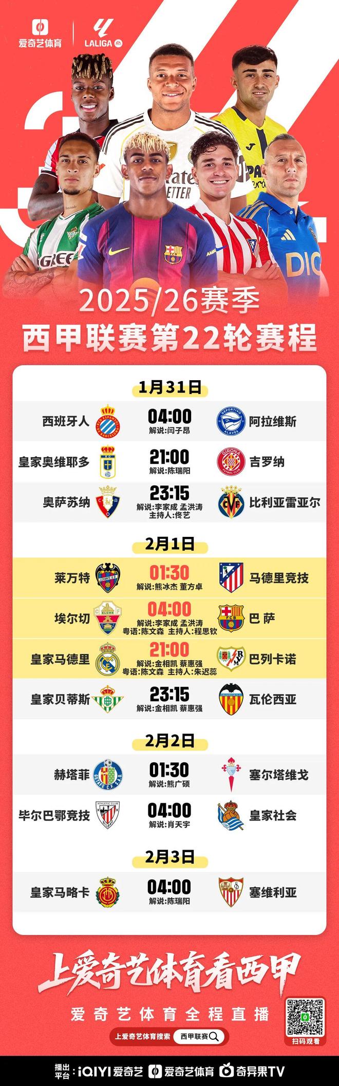 一場場精彩對決即將上演,2月1日讓我們共同期待西甲豪強(qiáng)與黑馬的精彩表現(xiàn)。