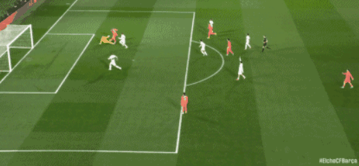 第28分鐘拉菲尼亞做球,奧爾莫的打門擊中了橫梁,逃過一劫的埃爾切,1分鐘之后,靠著羅德里格斯的反越位單刀,攻破了霍安加西亞的十指關,將比分追至1平,第34分鐘費蘭連續兩次打門都被門框拒絕,不過在6分鐘之后,費蘭還是接到德容的傳中,在點球點附近推射破門,幫助巴薩帶著2-1的比分,回到了中場更衣室。
