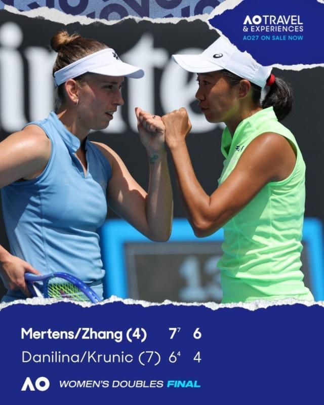 2026年澳網女雙決賽,4號種子張帥/梅爾滕斯7比6(4) 6比4擊敗7號種子達尼麗娜/克魯尼奇。這是張帥/梅爾滕斯搭檔第一次贏得大滿貫冠軍,也是37歲張帥摘得的第三座大滿貫雙打冠軍!她們將獲得81萬澳元(折合人民幣約392萬元)冠軍獎金。首盤比賽,張帥組合在1比4落后情況下,連贏4局,最終通過搶七以7比6(4)拿下第一盤。第二盤,張帥組合在5比0領先的情況下,兩次錯失冠軍點,被對手追成5比4,最終張帥組合在第三個發球勝賽局勝出。張帥繼2019年澳網搭檔斯托瑟收獲生涯大滿貫首冠后,再度斬獲澳網女雙冠軍。