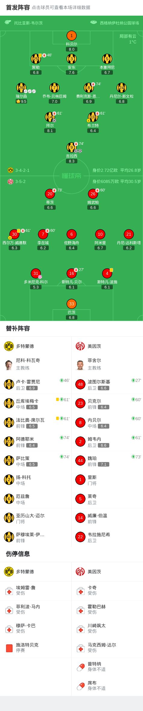 第73分鐘,多特換人調(diào)整,薩比策、阿德耶米替補上場