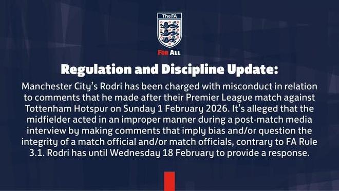 羅德里因在2026年2月1日與熱刺的英超比賽后發(fā)表的言論而被指控行為不當(dāng),據(jù)稱,他在賽后媒體采訪中發(fā)表了暗示偏見和/或質(zhì)疑比賽官員和/或比賽官員公正性的言論,這違反了英足總規(guī)則3.1,羅德里需在2月18日之前作出回應(yīng)。(公告完)